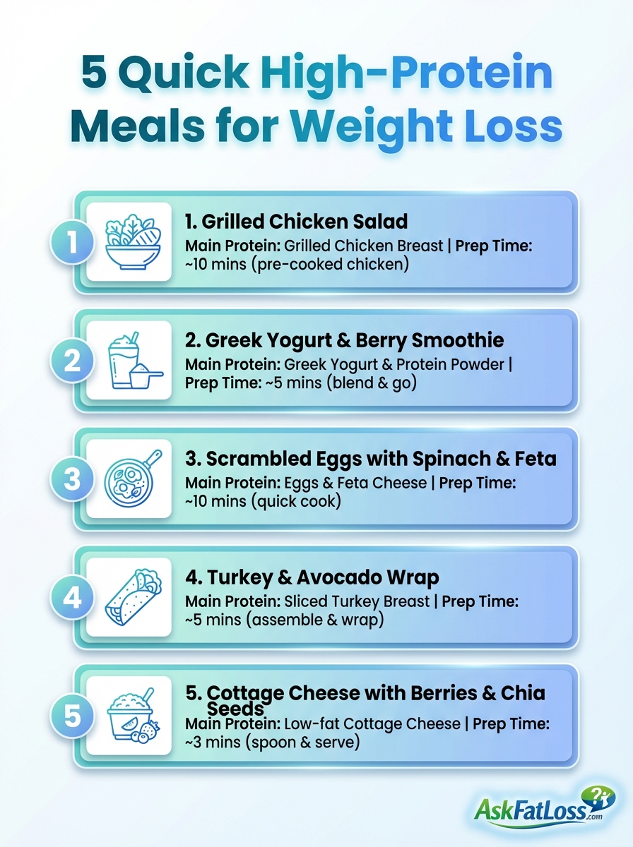 Five quick, high-protein meals are visualized to support weight loss. Each option is simple to prepare and balanced to keep you full and energized.
